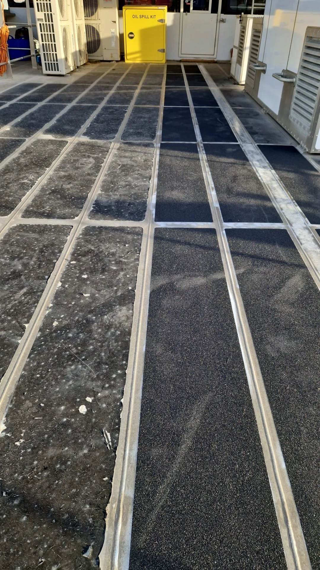 A 3 man team on this particular job involved starting the removal process and carrying out surface prep. With this underway, application of the new grip was carried out alongside.